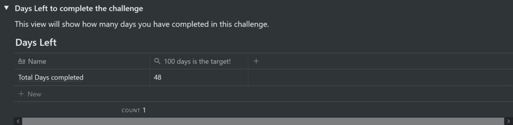 • Repeat the above steps until the completion or 100 days. You can view the total completed days in "Remaining Days/ Month" database and "Days Left to complete the challenge"